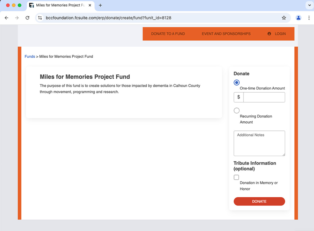Donations made to Miles For Memories are held at the Battle Creek Community Foundation. The green "link/button - DONATE TO MILES FOR MEMORIES" below will send you to the "Miles For Memories Community Project Fund" page at the Battle Creek Community Foundation website.